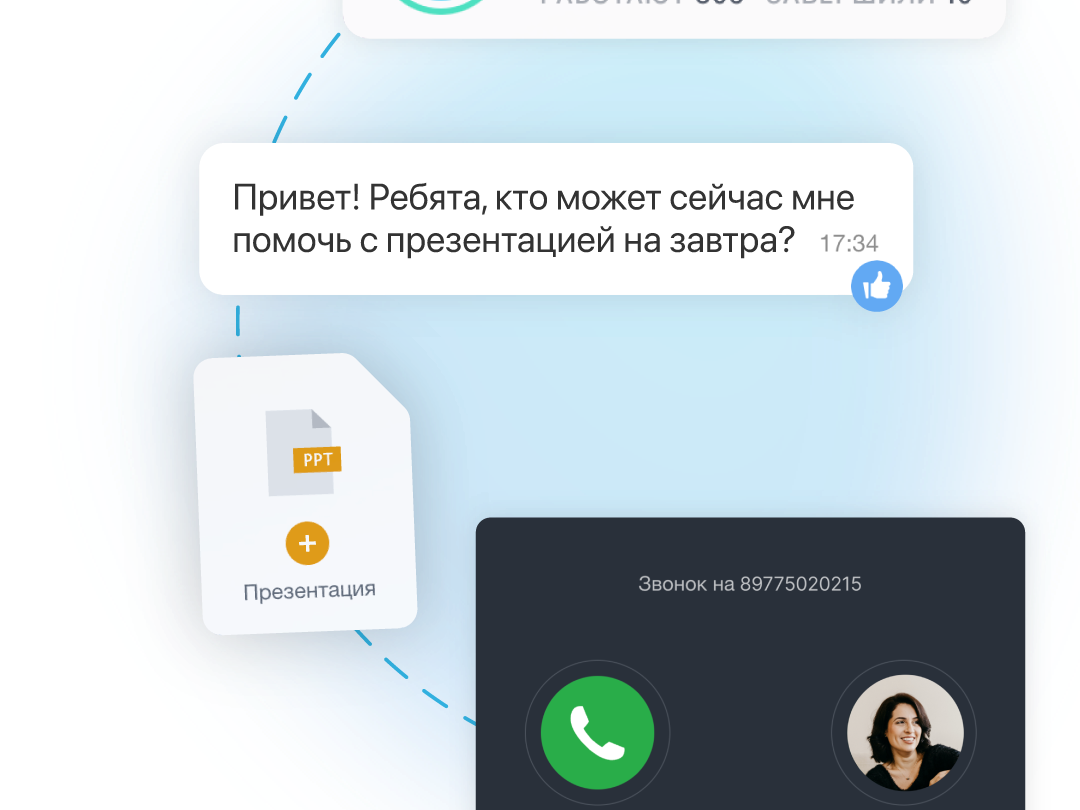 Коллеги, клиенты и подрядчики на связи — с высоким качеством видео и аудио, стабильным соединением и поддержкой групповых звонков до 48 человек. Звонок легко начать прямо из задачи, события в календаре или поста в Новостях компании.